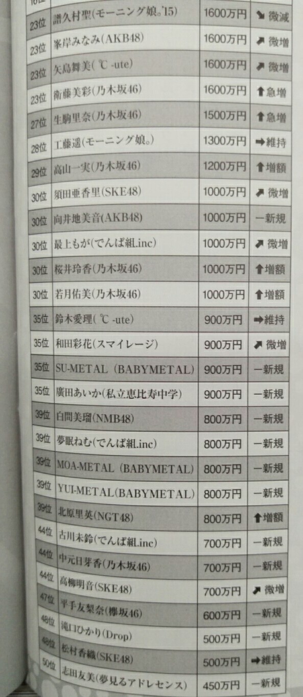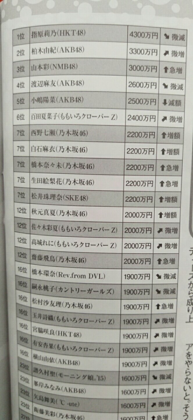 平手友梨奈、昨年の年収600万円と判明 2017年02月25日 カテゴリ:欅坂46 1: 2017/02/25(土) 21:05:43.27 1位の指原が4300万 7位の西野が2200万 47位の平手は600万 との事。 1年目ならこんなもんか。 もっと少ない気もするが。 【平手友梨奈、昨年の年収600万円と判明】の続きを読む タグ :#平手友梨奈